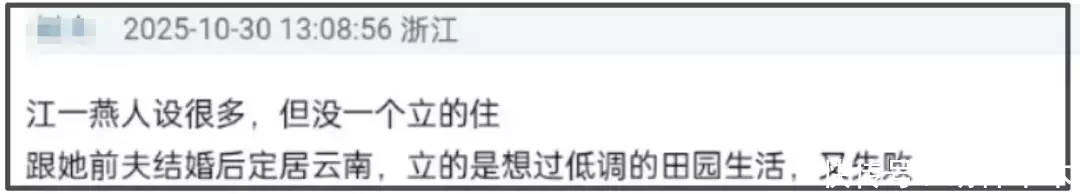 也有人觉得,人和人的生活方式并不一样,刘亦菲在娱乐圈存在感高,那是因为她没有自己的感情生活。江一燕在人设翻车后便选择低调与赵汉唐隐婚生女,在云南乡村过上了田园生活。