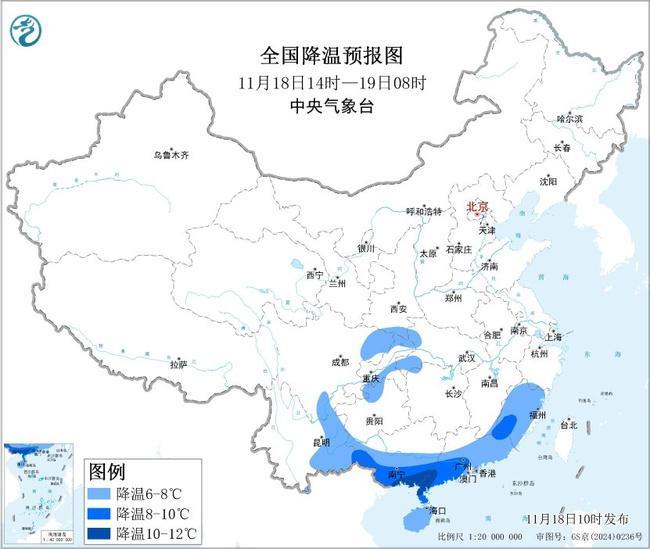 受强冷空气影响,预计,11月18日14时至19日8时,四川东部和南部、重庆、江西东部和南部、浙江南部、福建、广东东部和中南部、广西中南部、云南东部、海南岛等地有6℃~8℃降温,其中,广西南部、广东西南部等地的部分地区降温可达10℃以上。19日凌晨,最低温度0℃线将南压到苏皖南部至湖北中部一带。