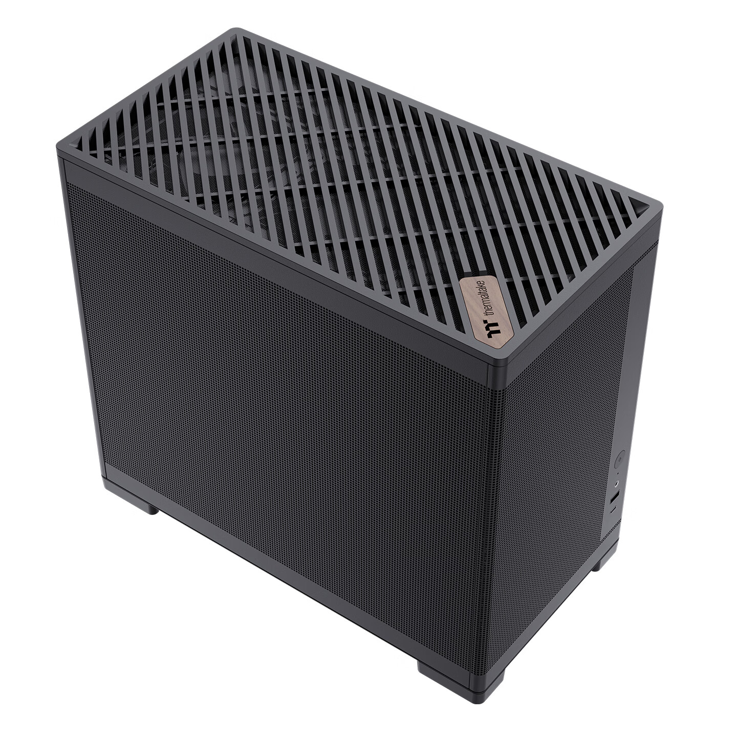 该机箱尺寸为 380x200x342mm,支持 M-ATX / ITX 主板。机箱顶部采用格栅设计,并带有木质曜越 Logo 铭牌,机箱支持三面快拆,正面提供了 1 个 USB-A 3.0 接口、1 个 USB-C 接口、1 个 3.5mm 音频接口。