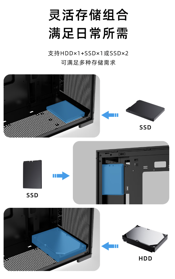 该机箱最多可安装 5 把风扇,其中顶部 / 底部均可安装双 120mm 风扇(支持顶置 240mm 水冷),后部可安装一把 120mm 风扇。机箱显卡限长 375mm、CPU 散热器限高 170mm。机箱内至多可安装 1 块 2.5 英寸 +1 块 3.5 英寸或 2 块 3.5 英寸硬盘。